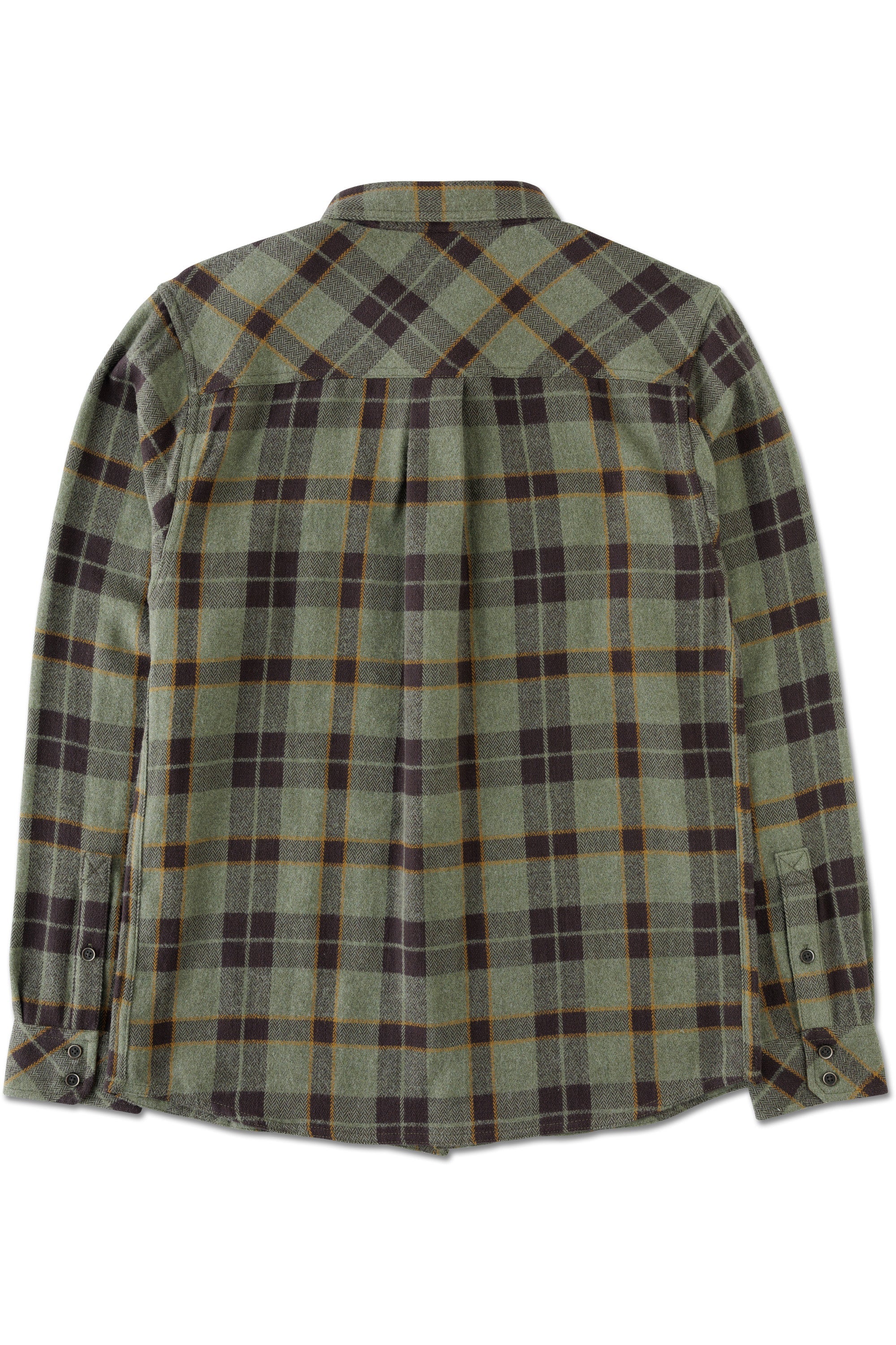 Casual fit, long sleeve button up shirt, stand collar with recycled polyester logo jacquard tape, two chest pockets with button closure, herringbone lined adjustable cuffs, back bias cut yoke with center back box pleat, 25% certified recycled polyester faux wood buttons, curved hem.