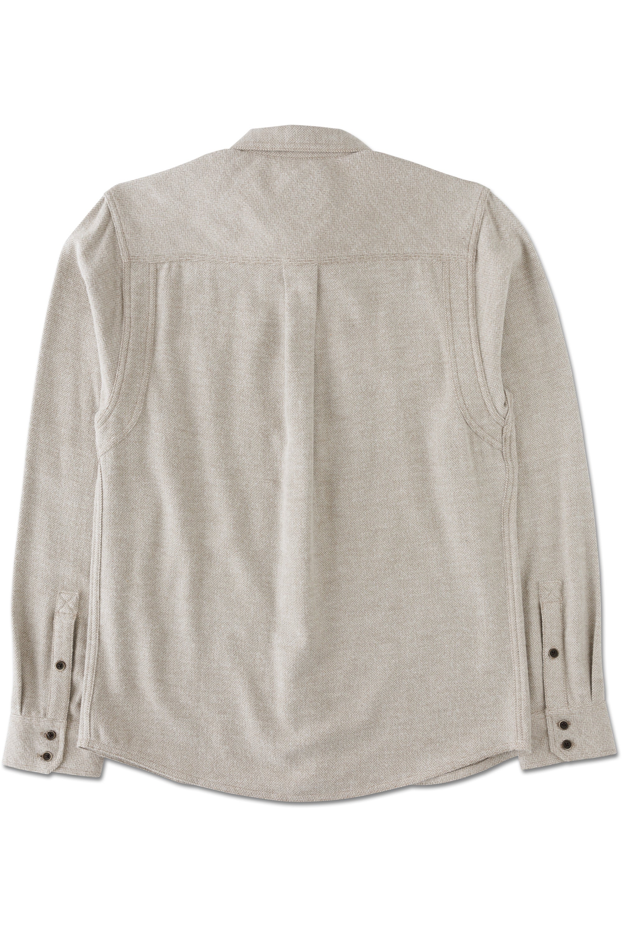 Casual fit, long sleeve button up shirt, stand collar with recycled polyester logo jacquard tape, two chest pockets with button closure (one with flap, one top entry with pen pocket), piecing at back armholes, natural twill lined adjustable cuffs and back bias cut yoke with center back box pleat, 25% certified recycled polyester faux wood buttons, curved hem.